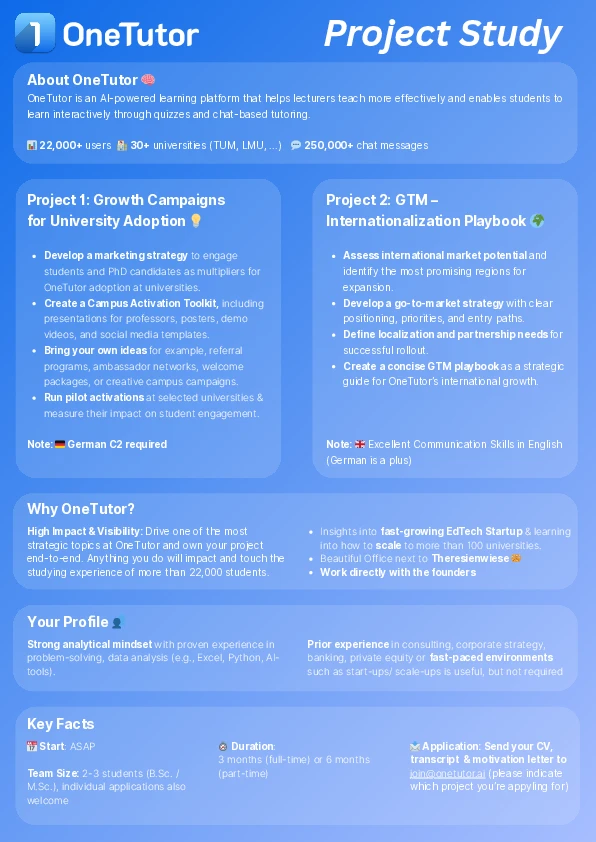 OneTutor is an AI-powered learning platform helping lecturers teach more effectively and enabling students to learn interactively through quizzes and chat-based tutoring. With 22,000+ users across 30+ universities (including TUM and LMU), OneTutor is one of Germany’s fastest-growing EdTech startups.